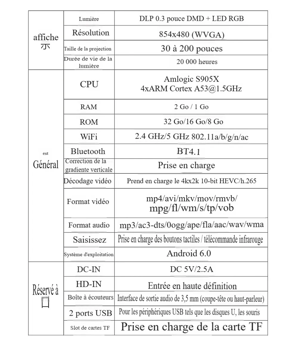 - résolution: 854*480 pixels prennent en charge le décodage 4K