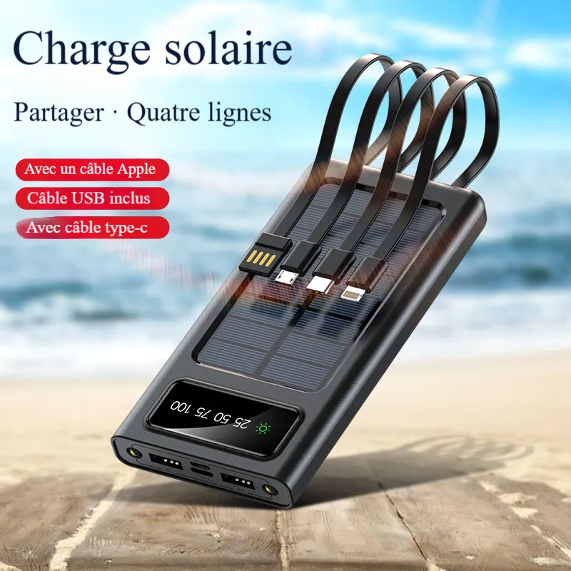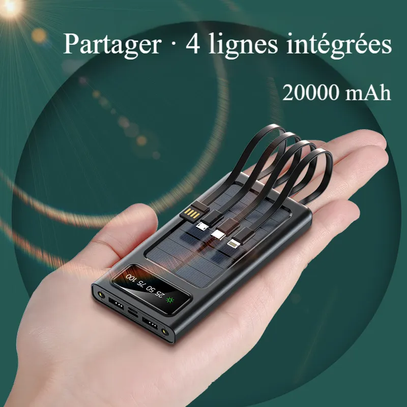 Batterie externe solaire 20 000 mAh, ultra-mince, pratique, avec ligne intégrée, idéale pour le camping en plein air