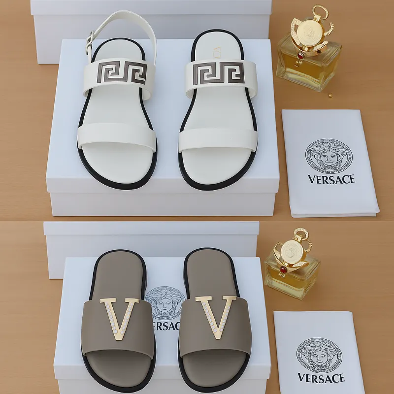 - ✔️ Design emblématique : disponibles en deux versions – sandales blanches à motif clé grecque et claquettes taupe ornées d’un V doré avec strass.