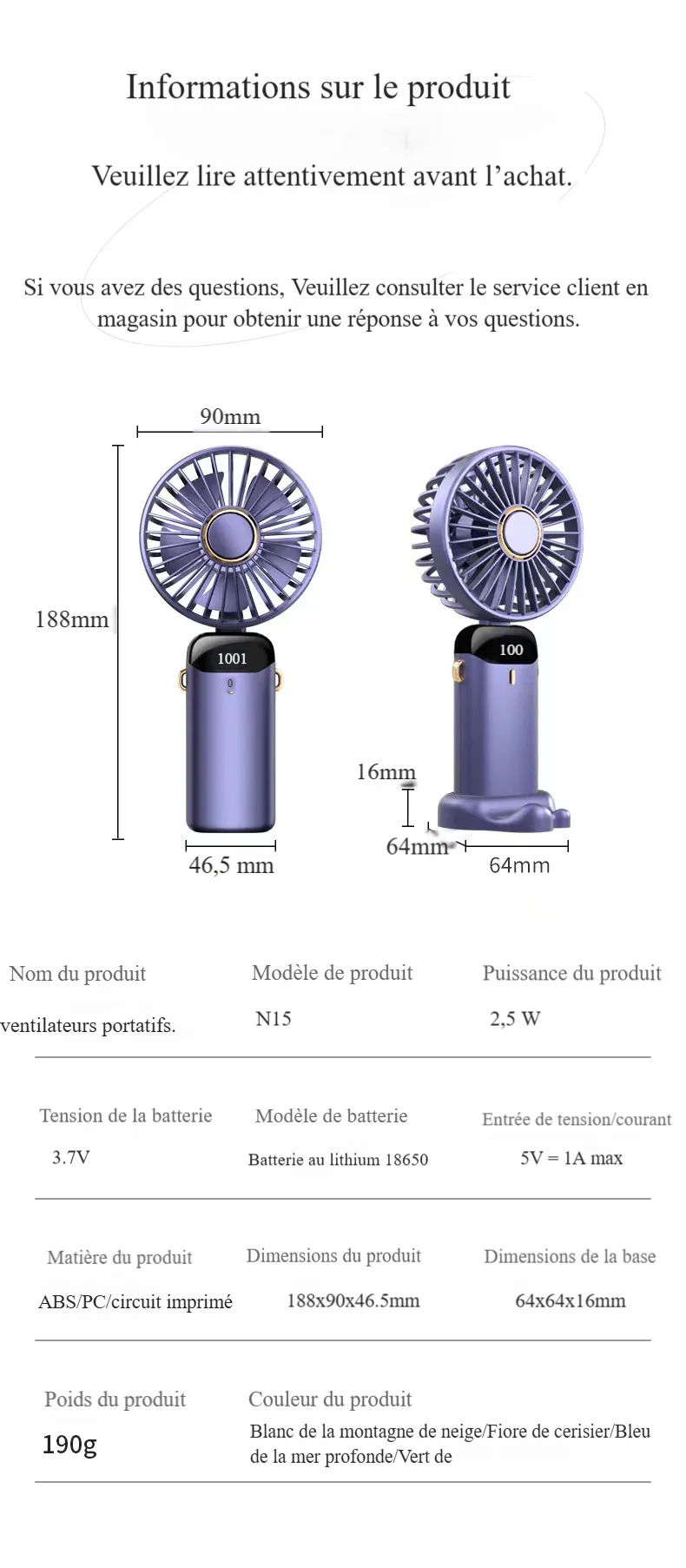 - Catégorie de ventilateur : Ventilateur portatif